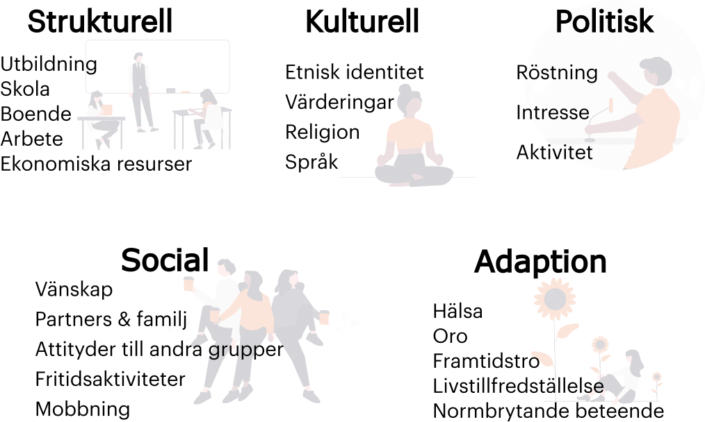 Här finns information om integration i flera dimensioner, så som strukturell, social, kulturell och politisk integration, samt information om ungdomars adaption, som innefattar till exempel framtidstro och hälsa.